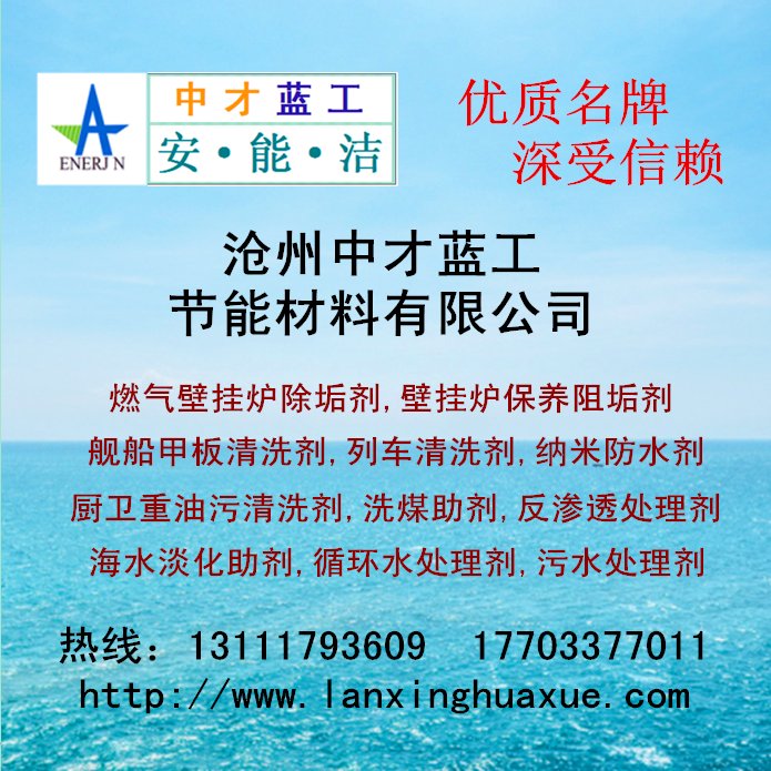 滄州中才藍工節(jié)能材料有限公司13111793609  17703377011 中才藍工安能潔AX-系列和AXNJ-系列: 凈水絮凝劑,高效除磷劑,cod去除劑,新型碳源,設(shè)備清洗劑,水泥煅燒增效脫硫催化劑,火電廠鍋爐脫硫脫硝劑,煙氣脫硫脫硝劑,節(jié)煤除渣除焦劑,除污除垢劑,環(huán)保融雪劑,供暖臭味變色劑,壁掛爐系統(tǒng)清洗阻垢劑,鍋爐除氧劑,啤酒瓶洗滌劑,燃氣爐專用阻垢劑,緩蝕阻垢劑,殺菌滅藻劑,硅基防水劑等。