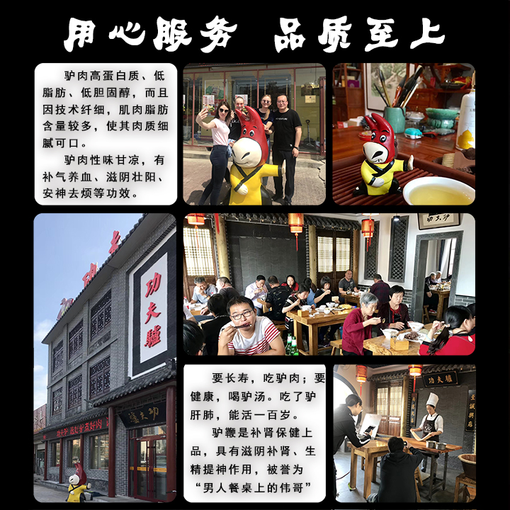功夫驢始于1717年的萬貫驢肉火燒小店。幾百年的發(fā)展完善,從只為果腹的廉價“大火燒”到乾隆口中的“蛤蟆吞蜜”一直發(fā)展到如今擁有工業(yè)化流程,標準化操作的現代化股份公司。功夫驢視質量如生命,從驢源的選擇、火燒加工、出品的時間,都設置了規(guī)范流程,確保了品質的安全和統(tǒng)一?,F在的功夫驢已從單純的驢肉火燒制作演變成擁有上百道驢肉精品菜系,驢肉火鍋、驢肉鍋仔、驢肉炒菜、驢肉水餃、驢肉餛飩、驢肉熏腸等系列驢產品的綜合性連鎖企業(yè)。